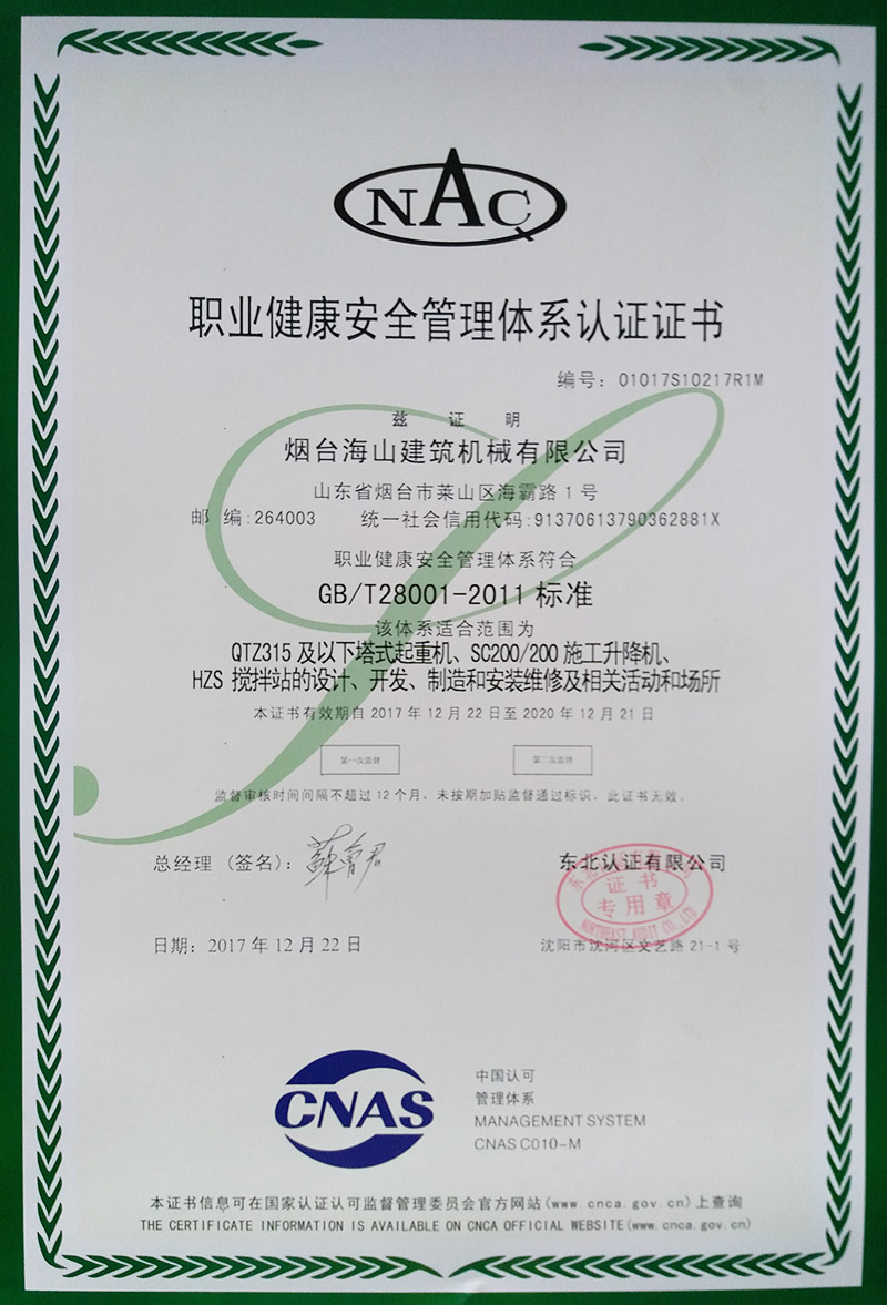 職業(yè)健康安全管理體系認證證書